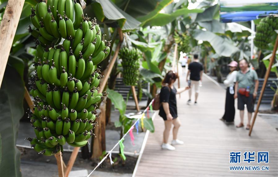 在吉林省永吉縣萬(wàn)昌鎮(zhèn)宇豐紅果木瓜產(chǎn)業(yè)園,游客與大棚內(nèi)的香蕉合影留念(8月12日攝)。新華社記者 許暢 攝