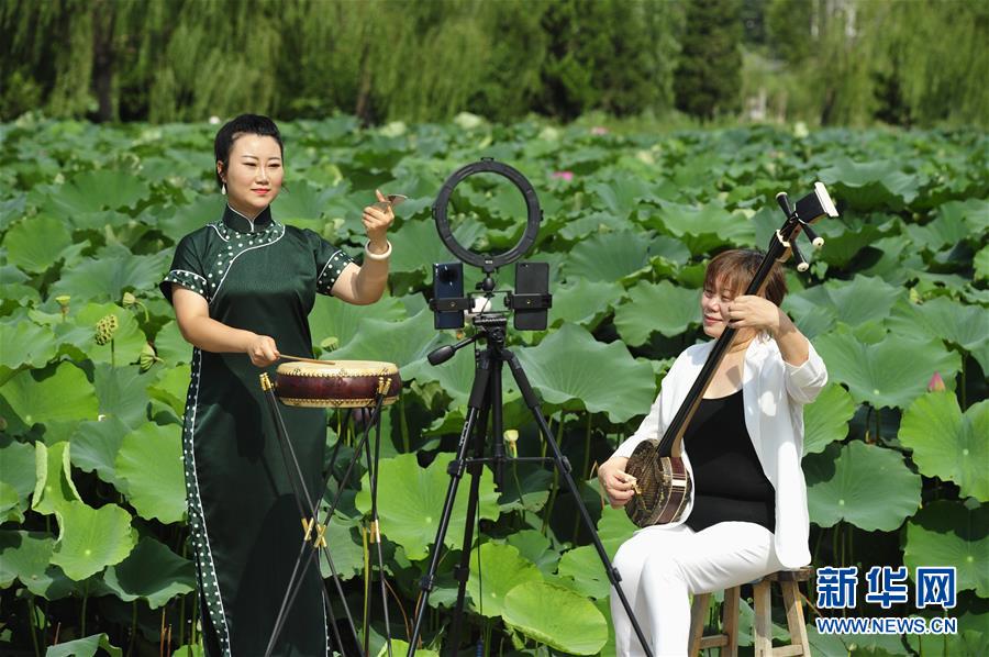 8月13日,河北省河間市西河大鼓非遺項目藝人李雪(左)、張領(lǐng)娣通過網(wǎng)絡(luò)直播表演西河大鼓。暑假期間,河北省河間市文化館推出非遺展演“云端”播系列活動,組織當?shù)匚骱哟蠊姆沁z項目傳承人利用視頻直播的方式進行線上展演,通過“云端”傳承非遺文化。新華社記者朱旭東攝
