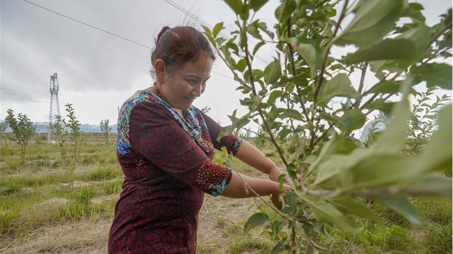 在新疆察布查爾錫伯自治縣一處生態(tài)扶貧林,當(dāng)?shù)刎毨魧⑿藜敉甑臉渲丶椅股螅?月16日攝)。