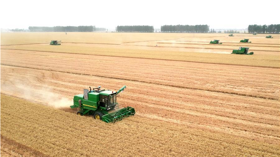 “三夏”時(shí)節(jié),中原大地一片金黃。位于河南省周口市的黃泛區(qū)農(nóng)場機(jī)聲隆隆,10萬畝小麥?zhǔn)斋@正酣。