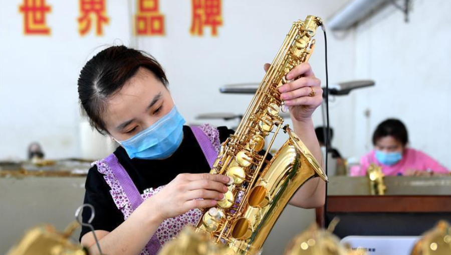6月2日,工人在武強(qiáng)縣一家樂器廠生產(chǎn)車間內(nèi)組裝薩克斯。