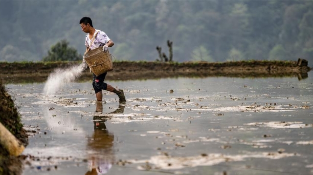 5月17日,在吉林省長(zhǎng)春市雙陽(yáng)區(qū)徐家村,農(nóng)民在水稻田間耕作。