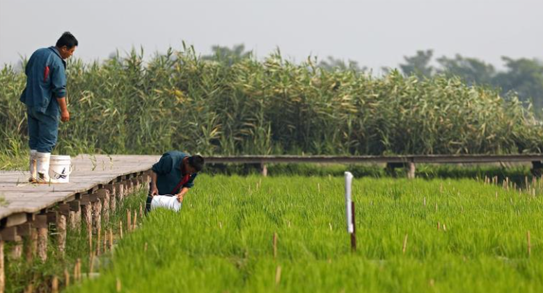 ?盤錦市胡家鎮(zhèn)農(nóng)民張海濤在自家稻田里查看水稻和稻田里河蟹的長勢(無人機照片,7月21日攝)。