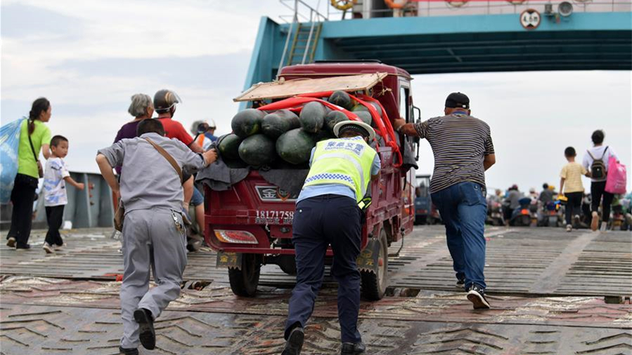 在江西省九江市柴桑區(qū)江新洲的渡口,交警協(xié)助居民有序轉(zhuǎn)移。