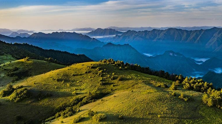 夏日的朝霞中,起伏的草甸仿佛一塊寬大無邊的綠色地毯,鑲嵌在大巴山上,如詩如畫。