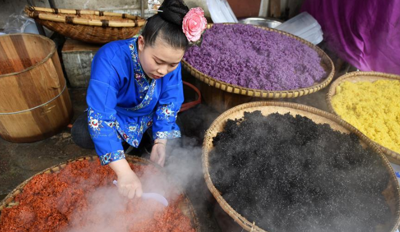 4月17日,在貴州省臺江縣姊妹街哆蝶五彩姊妹飯體驗店,苗家婦女展示使用不同植物的葉和花制作的五彩“姊妹飯”。