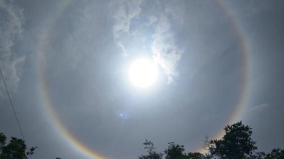 日照當(dāng)頭,太陽周圍被一個(gè)碩大的光圈包裹,形成一幅絕美景象,網(wǎng)友驚呼“美到窒息”。
