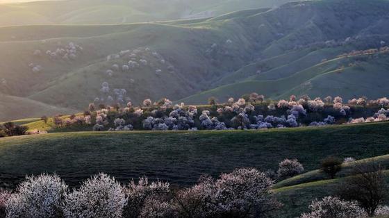 新疆天山腳下的霍爾果斯大西溝風(fēng)景優(yōu)美,山頂上白雪皚皚,山腳下春意濃濃。