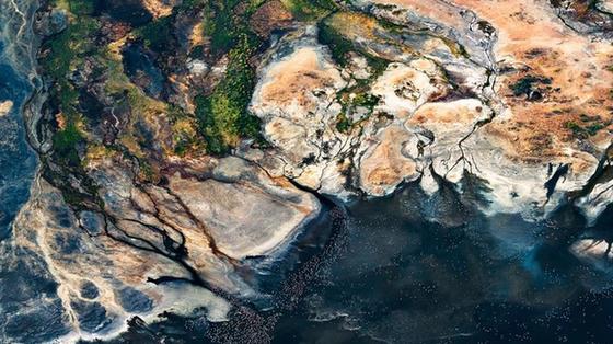 坦桑尼亞北部納特龍湖,一群火烈鳥飛過“火星地”。這個(gè)湖生長著大量紅色素藍(lán)藻,許多以此為食的各色的鳥聚集在這。