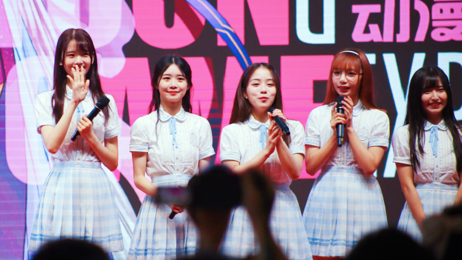 吳謹(jǐn)言身穿藍(lán)色上衣搭配白裙秀美腿,少女感十足。