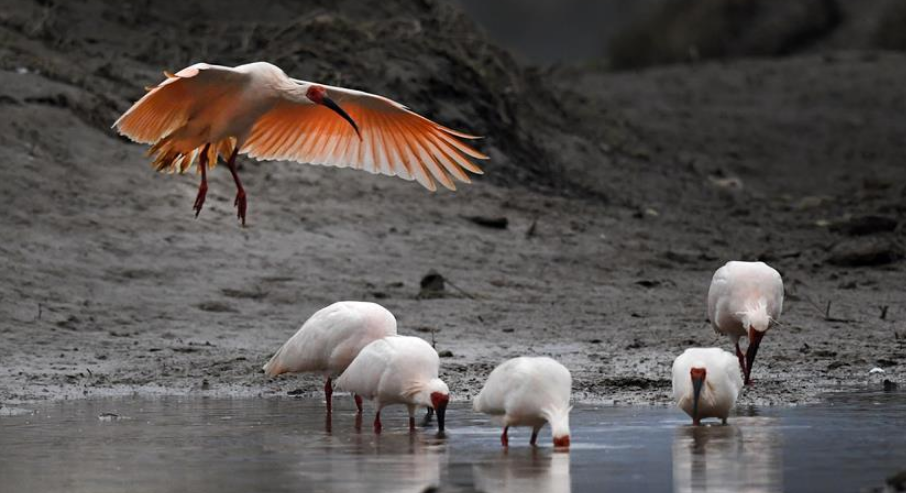 每年冬季,成群結(jié)隊(duì)的朱鹮飛翔在漢江及漢江支流的河灘、濕地,覓食、棲息,成為當(dāng)?shù)匾坏懒聋惖娘L(fēng)景線。?