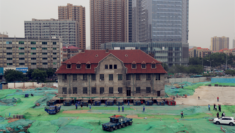山東濟(jì)南2600噸百年修女樓坐“車”準(zhǔn)備平移