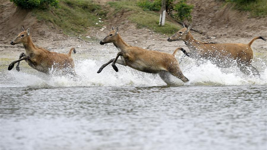 6月10日在江蘇大豐麋鹿國家級自然保護(hù)區(qū),麋鹿在水塘覓食。