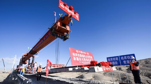 中鐵一局的施工人員在格庫鐵路新疆段鋪設(shè)最后一組軌排。