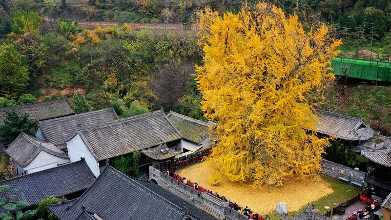 初冬時節(jié),陜西省西安市長安區(qū)羅漢洞村終南山古觀音禪寺內(nèi)的千年銀杏樹滿目金黃,落葉宛如金毯,吸引游客前來參觀游覽。