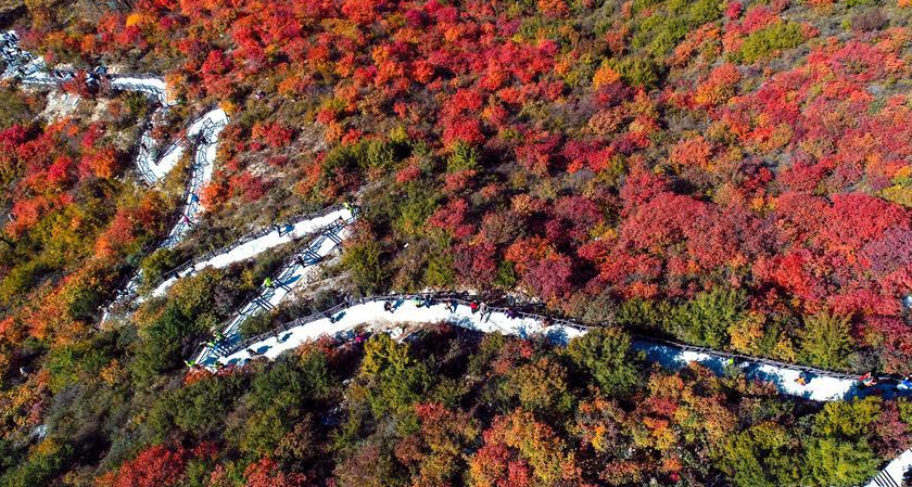 金秋十月,河北省涉縣偏城鎮(zhèn)太行紅葉大峽谷的紅葉進(jìn)入觀賞佳期,吸引眾多游客前來(lái)登山賞景。