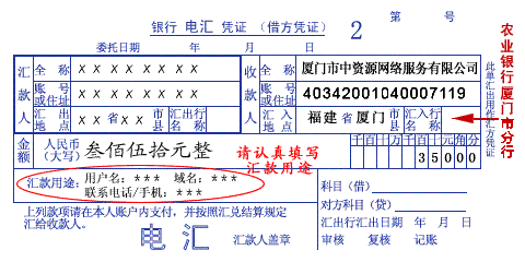 | 提示:工行行號(CNAPS CODE):102393000884;農(nóng)行行號(CNAPS CODE):103393034200 備注:請注明您的用戶名、域名、聯(lián)系電話/手機(jī)等 匯款后請把您的匯款憑證寫上域名后,傳真至我司或掃描后以附件形式發(fā)送至我司業(yè)務(wù)專員郵箱。 |