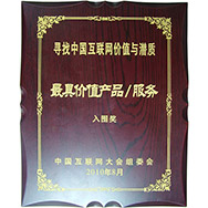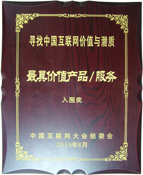 2010互聯網大會最具價值產品/服務 入圍獎榮譽證書