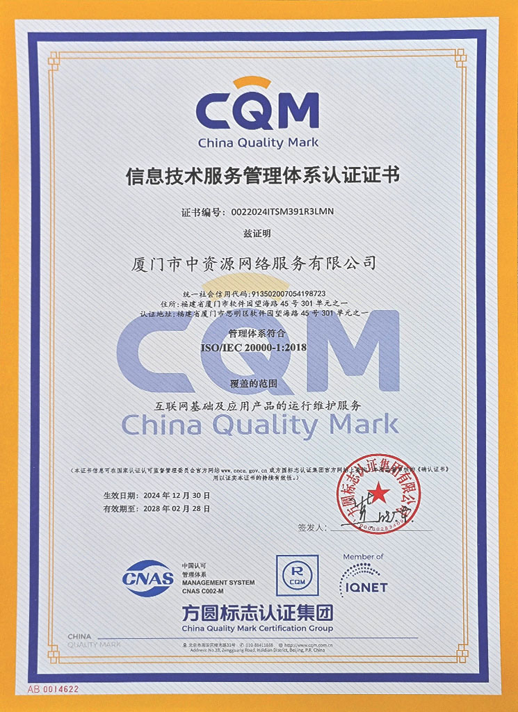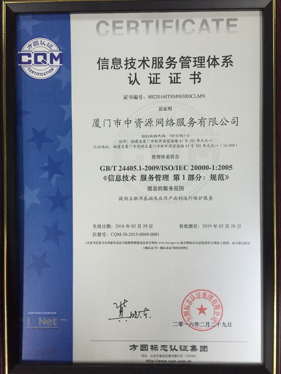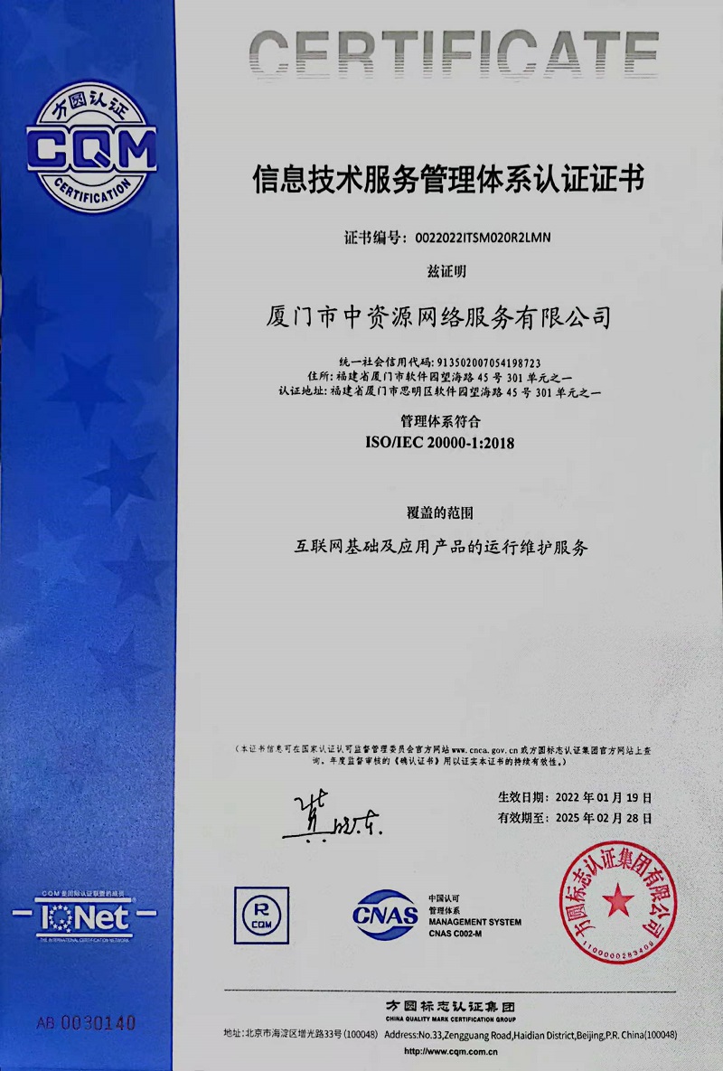 CQM信息技術服務管理體系認證ISO/IEC 20000證書