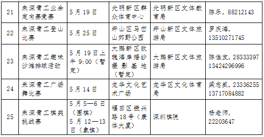 活動期間,全市將舉辦25項全市性重要活動,分為6項活動,19項比賽。其中,6項活動為開幕式、“行走鵬城 感受深圳”惠民活動、全市勞務(wù)工讀書成才巡回報告會、來深青工文體節(jié)回顧圖片展、閉幕式及優(yōu)秀獲獎節(jié)目展演;19項比賽活動分別是來深青工歌手大賽(全國)、才藝大賽、攝影大賽(全國)、美術(shù)大賽、書法大賽、知識競賽、演講比賽、打工文學(xué)大賽(全國)、羽毛球混合團(tuán)體賽、跳繩比賽、乒乓球競賽、趣味體育比賽、拔河比賽、三人籃球賽、業(yè)余定向賽競賽、登山比賽、棋類挑戰(zhàn)賽、趣味沙灘排球比賽、廣場健身操比賽。參賽對象主要為在深工作的18至50歲非深戶籍人士(不包括在各類文化演藝公司、培訓(xùn)機(jī)構(gòu)中從事文藝表演、培訓(xùn)的專業(yè)人員)。