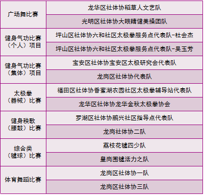 福田區(qū)社會體育指導(dǎo)員協(xié)會、羅湖區(qū)社會體育指導(dǎo)員協(xié)會、鹽田區(qū)社會體育指導(dǎo)員協(xié)會、龍崗區(qū)社會體育指導(dǎo)員協(xié)會