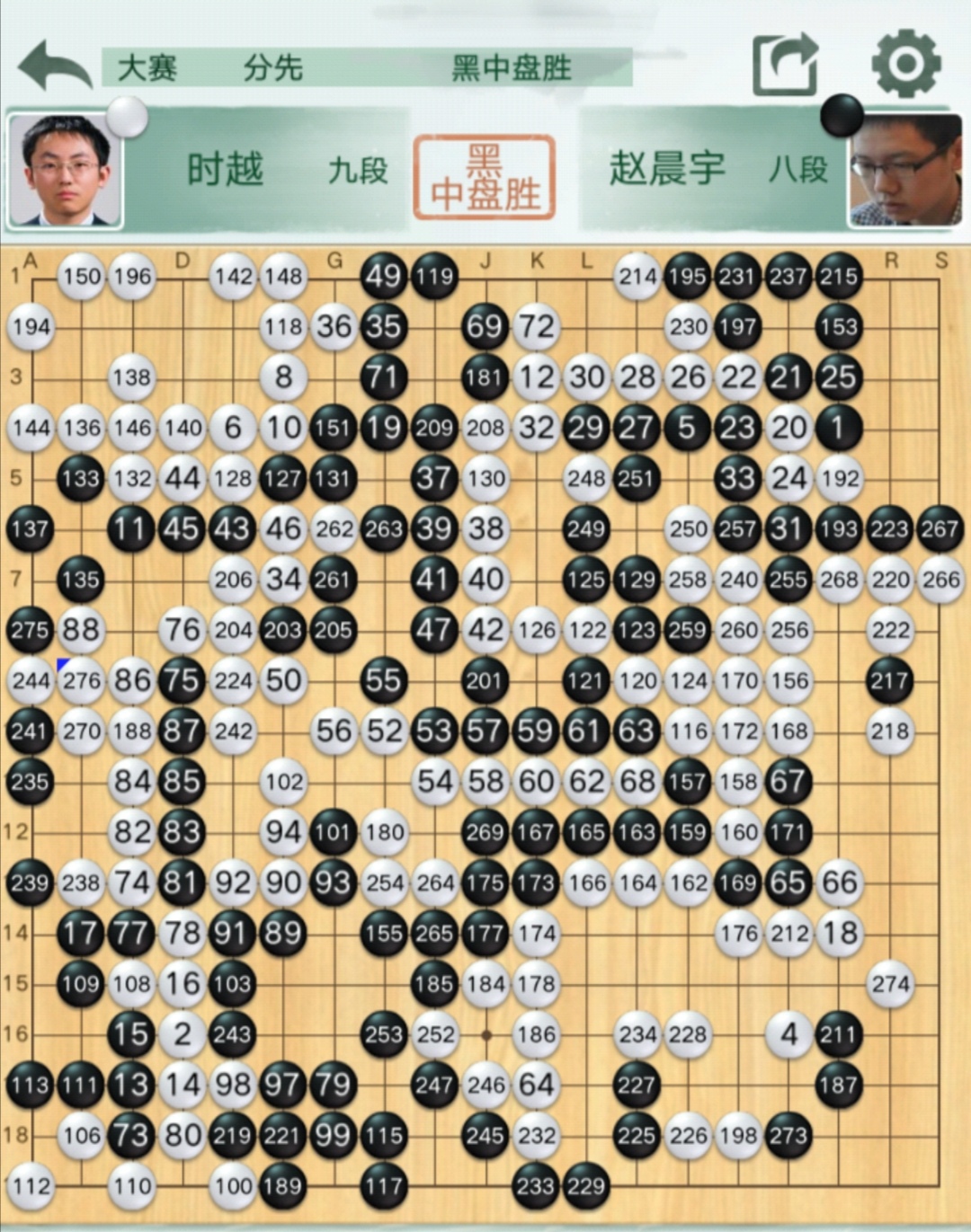 二臺(tái)(主將):時(shí)越九段執(zhí)白(負(fù))趙晨宇八段