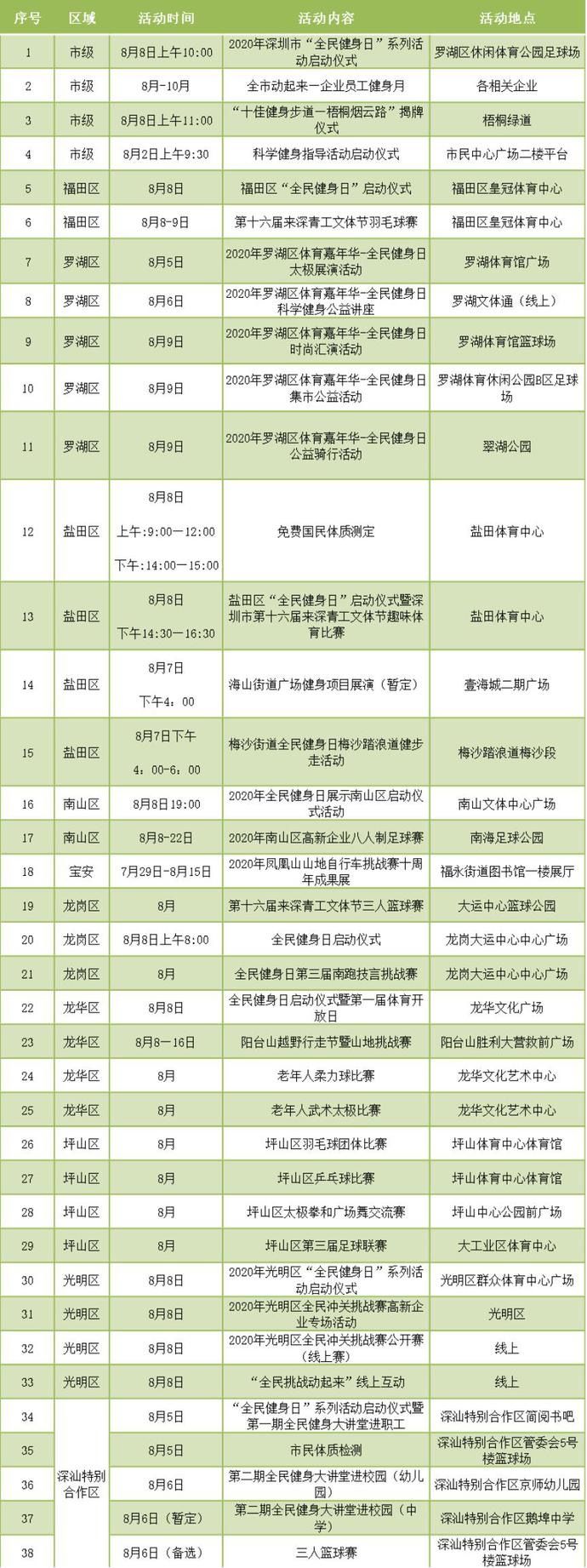 在啟動當(dāng)日,全市各區(qū)也同步聯(lián)動,啟動了“全民健身日”系列活動。即日起至8月10日,深圳將陸續(xù)推出近40項全民健身運動系列活動,內(nèi)容涵蓋來深青工文體節(jié)、企業(yè)員工健身月、體育嘉年華系列展演、全民沖關(guān)線上挑戰(zhàn)賽、足球、籃球、老年太極、柔力球、國民體質(zhì)測定、全民健身大講堂、健身步道健步行等。此外,全市各公益體育館也將面向市民免費開放,大家可關(guān)注各場館進(jìn)行預(yù)約。