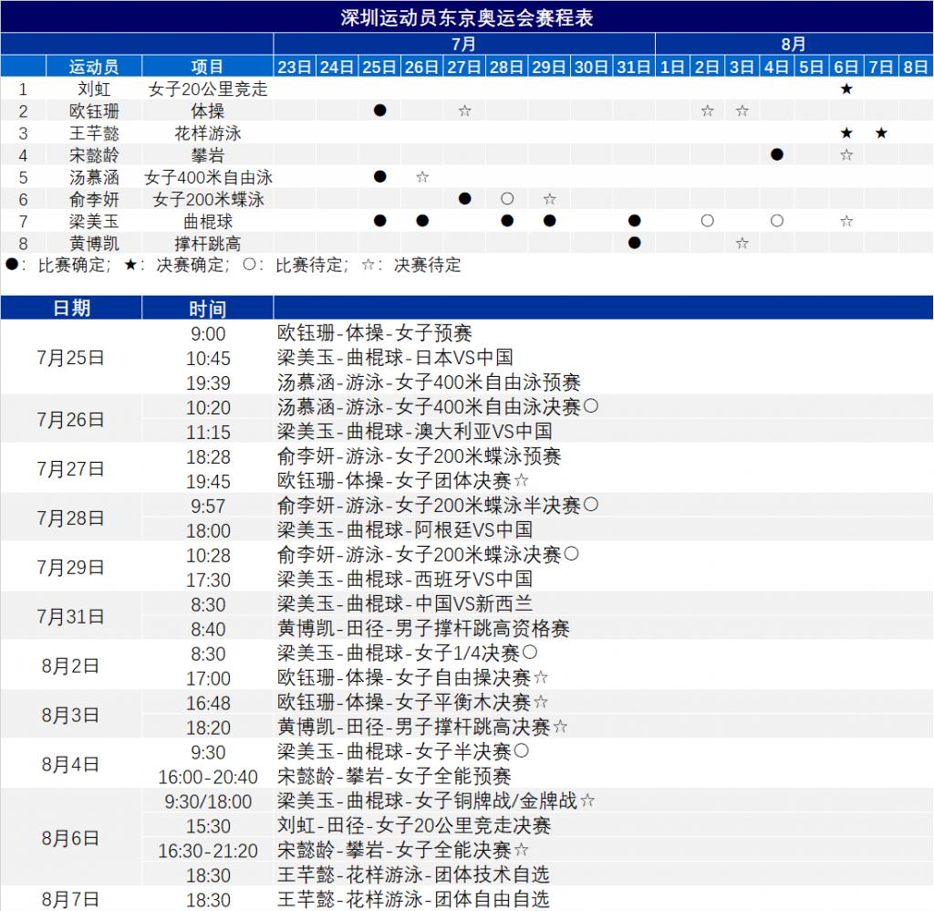 7月19日,深圳市文化廣電旅游體育局整理公布了深圳健兒在東京奧運(yùn)會上的比賽日歷。