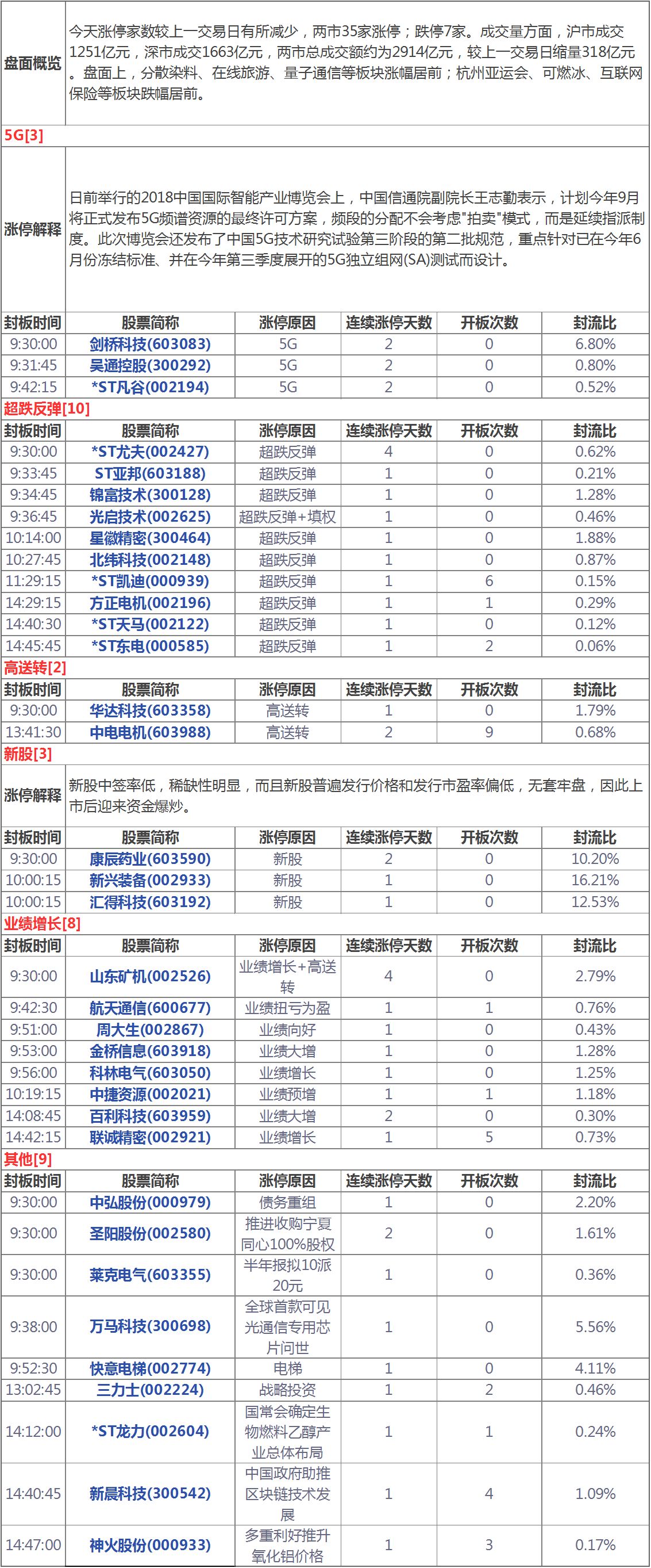 今天漲停家數較上一交易日有所減少,兩市35家漲停;跌停7家。成交量方面,滬市成交1251億元,深市成交1663億元,兩市總成交額約為2914億元,較上一交易日縮量318億元。盤面上,分散染料、在線旅游、量子通信等板塊漲幅居前;杭州亞運會、可燃冰、互聯網保險等板塊跌幅居前。
