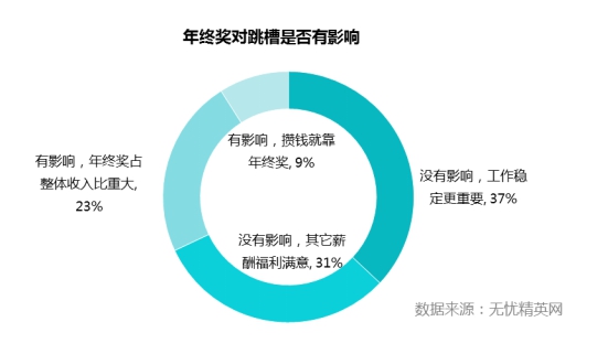 但是即便大部分人對今年的年終獎的增長沒有信心,卻很難讓他們因為年終獎而跳槽。半數(shù)以上的受訪者年終獎?wù)既晔杖氲谋壤齼H為20%左右,即便不滿意年終獎,但工作的穩(wěn)定性、工作環(huán)境、企業(yè)福利是他們更看重的要素。有3成受訪者表示收入依賴年終獎,如果年終獎不滿意一定會尋找機會跳槽。因此企業(yè)在人才管理上,需要特別注意年終獎對于員工保留的影響,提前做好預(yù)防工作。