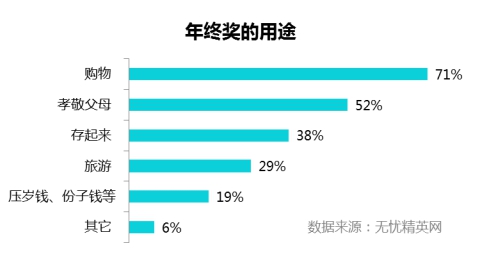在年終獎的使用上,71%的人會用于購物,52%的人會用于孝敬父母,38%的人會將年終獎存一部分起來,29%的會用于旅行。超過一半的人,以上年終獎的使用類別超過了3項,人生的那點小夢想,全仰仗年終獎?!捌綍r每個月還完房貸,收入只夠生活,提升生活質(zhì)量,全靠年終獎,去年的年終獎,我給自己買了臺蘋果筆記本電腦;今年的年終獎,準備用來去普吉島旅行,沒有年終獎肯定要哭死?!?剛在上海買了房的小杰告訴我們。