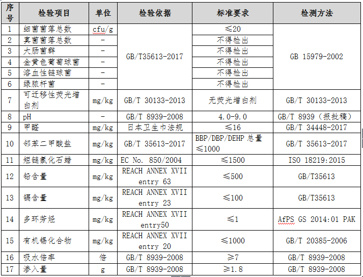 安全性能指標(biāo)包括微生物、甲醛、pH、可遷移性熒光增白劑、化學(xué)物質(zhì)等五個(gè)方面。