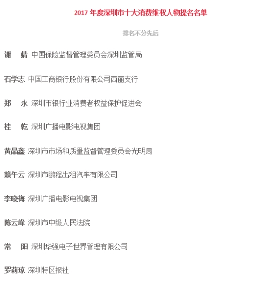 附:“2017年度深圳市十大最美消費維權人物”名單(排名不分先后)