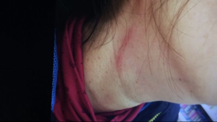 事后,羅小姐的母親張女士很快打電話報了警。張女士今年52歲,女兒提到母親的傷勢非常心疼,“我母親頭部腫起,脖子上有三處抓痕(有出血),手指也被抓傷,之后幾天右側(cè)腰部和右膝都感覺疼痛。”