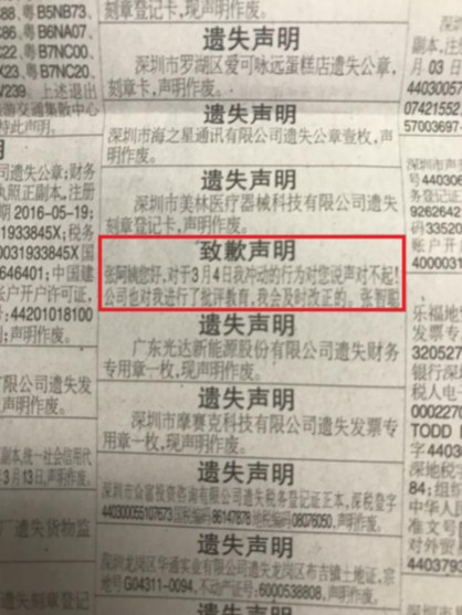 在3月24日的報紙上,記者在整版密密麻麻的分類信息中,終于找到了埋藏在其中的一條“致歉聲明”——“張阿姨您好,對于3月4日我沖動的行為對您說聲對不起!公司也對我進(jìn)行了批評教育,我會及時改正的?!庇浾呗?lián)系該版服務(wù)熱線,對方表示登報這則致歉聲明的價格為200元左右。(田志強(qiáng))