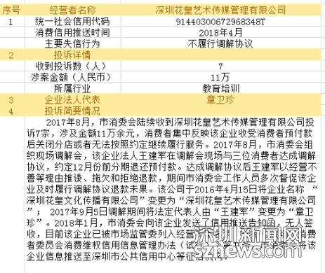 2017年8月,市消委會(huì)陸續(xù)收到深圳花皇藝術(shù)傳媒管理有限公司投訴7宗,涉及金額11萬余元,消費(fèi)者集中反映該企業(yè)收受消費(fèi)者預(yù)付款后關(guān)閉分店或者無法按照約定繼續(xù)履行服務(wù)。2017年8月,市消委會(huì)組織現(xiàn)場(chǎng)調(diào)解會(huì),該企業(yè)法人王建軍在調(diào)解會(huì)現(xiàn)場(chǎng)與三位消費(fèi)者達(dá)成調(diào)解協(xié)議,約定12月份前分期退還預(yù)付款。達(dá)成調(diào)解協(xié)議后王建軍以經(jīng)營(yíng)不善等理由推諉、拖欠和拒絕退款,期間市消委會(huì)工作人員多次督促該企業(yè)及時(shí)履行調(diào)解協(xié)議退款未果。該公司于2016年4月15日將企業(yè)名稱 “深圳花皇文化傳播有限公司”變更為“深圳花皇藝術(shù)傳媒管理有限公司”; 2017年9月5日調(diào)解期間將法定代表人由“王建軍”變更為“章衛(wèi)珍”。2018年1月,市消委會(huì)向該企業(yè)發(fā)送了信用推送告知函,無人簽收,目前該企業(yè)已被市場(chǎng)監(jiān)管委列入經(jīng)營(yíng)異常名錄。依據(jù)《深圳市消費(fèi)者委員會(huì)消費(fèi)維權(quán)信用信息管理辦法(試行)》第九條,市消委會(huì)將該企業(yè)信息推送至深圳市公共信用中心等征信機(jī)構(gòu)。該企業(yè)雖然變更了公司名稱和法定代表人等公司信息,但仍需承擔(dān)原企業(yè)未履行的法定或約定義務(wù)。