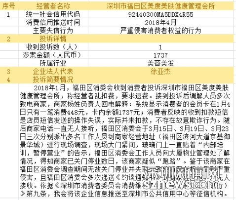2018年1月,福田區(qū)消委會(huì)收到消費(fèi)者投訴深圳市福田區(qū)美度美膚健康管理會(huì)所,稱經(jīng)營(yíng)者亂扣費(fèi),要求退回余額(會(huì)員卡余額1737元)。接到投訴后調(diào)解人員多次致電商家,商家楊姓負(fù)責(zé)人回電解釋:系統(tǒng)顯示消費(fèi)者的會(huì)員卡在1月4日只有一筆消費(fèi)448元,卡內(nèi)余額1737元;消費(fèi)者反映的收到扣款短信是店員短信發(fā)送的操作失誤,實(shí)際并未扣款,不存在故意欺詐行為。隨后商家電話一直無人接聽,福田區(qū)消委會(huì)于3月15日、3月19日、3月23日三次分別派出多名工作人員到商家經(jīng)營(yíng)地址(福田區(qū)濱河大道京基御景華城)進(jìn)行現(xiàn)場(chǎng)調(diào)查,現(xiàn)場(chǎng)大門緊閉,玻璃門上一直貼著“內(nèi)部培訓(xùn),暫停營(yíng)業(yè)”的告示,福田區(qū)消委會(huì)工作人員向大廈物業(yè)管理處了解情況,得知商家已關(guān)門停業(yè)數(shù)日,該商家疑似“跑路”。鑒于該商家在福田區(qū)消委會(huì)調(diào)查期間無故關(guān)門停業(yè)并失聯(lián),致使消費(fèi)者權(quán)益受到嚴(yán)重侵害,且福田區(qū)消委會(huì)多次遞送《約談通知書》到商家經(jīng)營(yíng)地,均無人接收。依據(jù)《深圳市消費(fèi)者委員會(huì)消費(fèi)維權(quán)信用信息管理辦法(試行)》第九條,我會(huì)將該企業(yè)信息推送至深圳市公共信用中心等征信機(jī)構(gòu)。