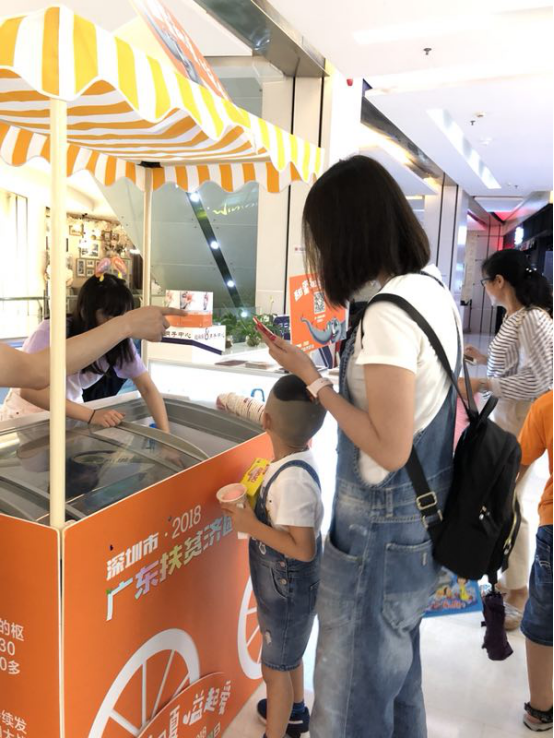 6月23日,“甜蜜初夏 慈善一直在”深圳10大地標(biāo)冰激凌義賣活動在在福田星河COCO Park啟動?,F(xiàn)場,很多逛商場的市民掃碼購買冰淇淋,為扶貧濟困活動捐款。特別讓志愿者感觸的是,不少家長帶著小朋友路過,看到是給貧困人們貢獻(xiàn)愛心,紛紛參與進(jìn)來要買冰激凌。