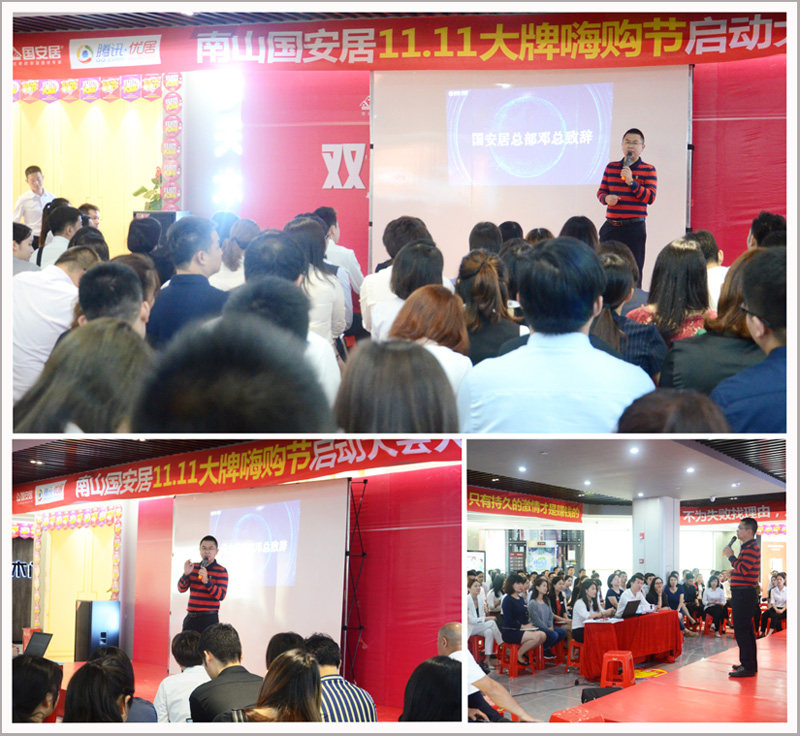 深圳新聞網(wǎng)訊 10月22日下午,“國安居南山店&騰訊優(yōu)居雙11大牌嗨購節(jié)”活動啟動大會在國安居南山店四樓隆重舉行。國安居南山店各品牌商家老板及銷售精英匯聚于此,正式擂響“雙11大促”的出征鼓!