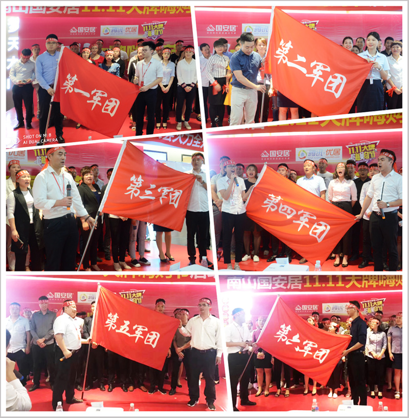隨后,來自南山店全體方陣隊(duì)員高舉隊(duì)旗,高喊口號,將現(xiàn)場氣氛推向高潮,品牌代表們紛紛上臺發(fā)言,幾百家建材家具品牌以第一軍團(tuán)、第二軍團(tuán)、第三軍團(tuán)、第四軍團(tuán)、等等團(tuán)隊(duì)方陣,登場亮相,高呼團(tuán)隊(duì)口號,并且當(dāng)場簽署了“雙11大促”的軍令狀,并從商場負(fù)責(zé)人手中接過了“雙11大促”的軍旗,這將預(yù)示著“國安居南山店&騰訊優(yōu)居雙11大牌嗨購節(jié)”定將以卓越的佳績,創(chuàng)造新一輪的銷售盛況!