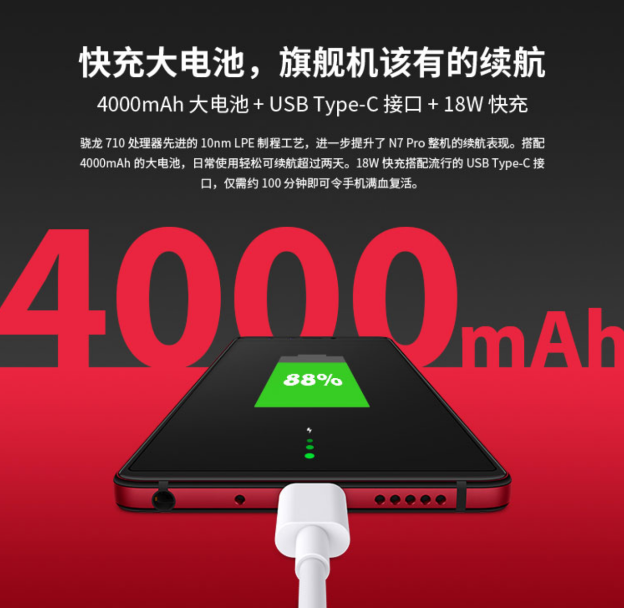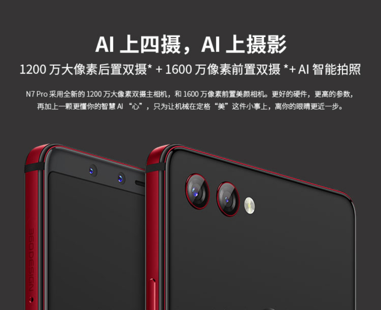 360手機(jī)N7 Pro采用了雙面玻璃機(jī)身設(shè)計(jì),無(wú)劉海5.99英寸全面屏,分辨率2160×1080像素,有珊瑚紅和瑪瑙黑兩色可選。作為2018年度的旗艦機(jī)型,配置上,N7 Pro搭載當(dāng)前高通家族中最受關(guān)注的驍龍710處理器,4000mAh大容量電池,支持18W快充,官方宣稱(chēng)20分鐘可充電30%,100分鐘可充滿。此外在拍照方面,360手機(jī)N7 Pro采用了堪稱(chēng)耀眼的四攝設(shè)計(jì)。