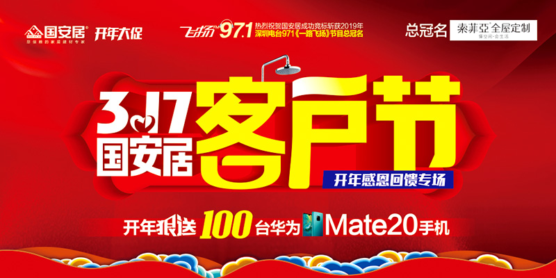 國(guó)安居一直心懷感恩,感謝十多年來累計(jì)30萬老客戶的信賴與支持,此次活動(dòng)不僅是為了品牌優(yōu)惠,更多的是給老客戶送去關(guān)懷和福利。國(guó)安居特聯(lián)合深圳電臺(tái)971王牌節(jié)目一路飛揚(yáng)鼎力巨獻(xiàn),聯(lián)手旗下百位工廠總裁打造開年大促,推出多重優(yōu)惠:1、開年狠送100臺(tái)華為mate20手機(jī);2、聯(lián)購(gòu)滿額返100萬現(xiàn)金,上不封頂?shù)瘸祷仞伝顒?dòng),以3.15為契機(jī)來回饋多年來關(guān)注國(guó)安居、支持國(guó)安居的廣大消費(fèi)者,以最大限度的優(yōu)惠、最為超值的實(shí)惠、最為驚喜的鉅惠獻(xiàn)禮3.17大促!