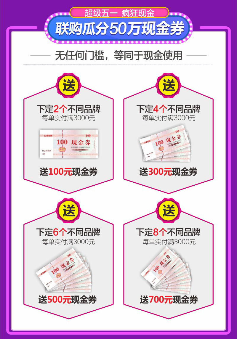 3、聯(lián)購滿額瓜分50萬現(xiàn)金券:5月1日-5月4日活動(dòng)期間,顧客每單實(shí)付3000元,下定2個(gè)不同品牌,即送100元現(xiàn)金券,下定4個(gè)不同品牌,即送300元現(xiàn)金券,下定6個(gè)不同品牌,即送500元現(xiàn)金券,國安居準(zhǔn)備了50W現(xiàn)金券,送完即止。
