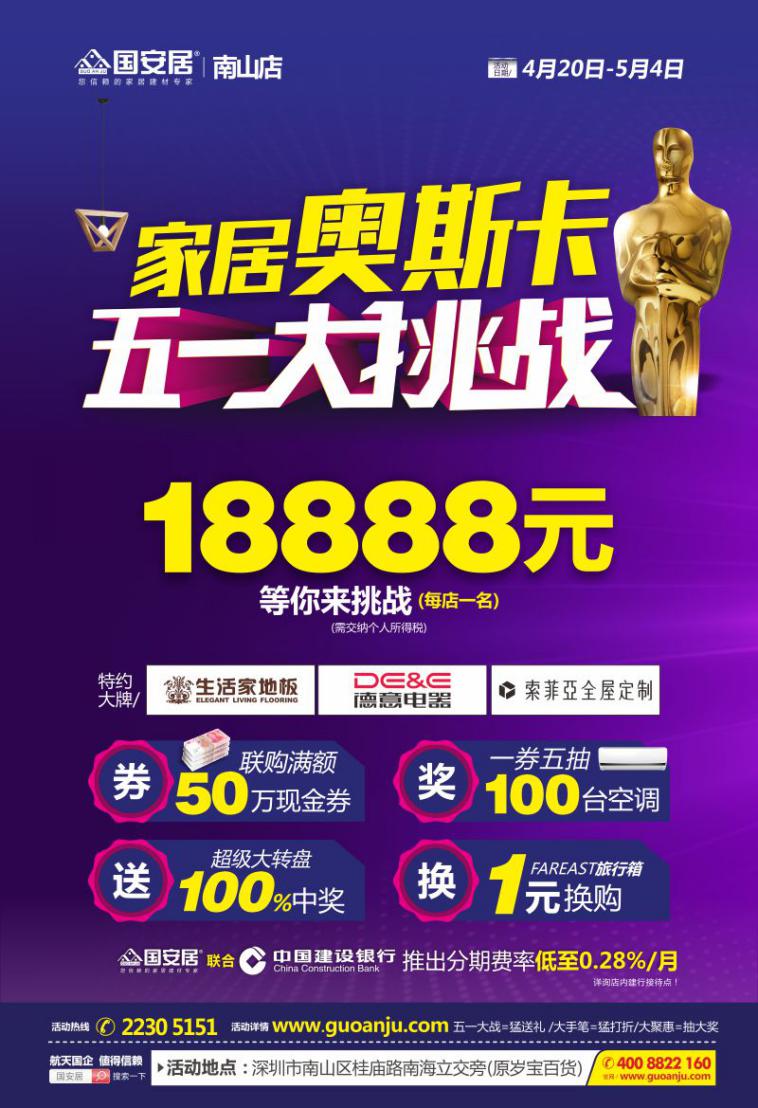 4月20號(hào)~5月4號(hào),南山國安居家居奧斯卡五一大挑戰(zhàn)盛大開啟,一大波福利和超值優(yōu)惠來襲,準(zhǔn)備好接招了嗎?