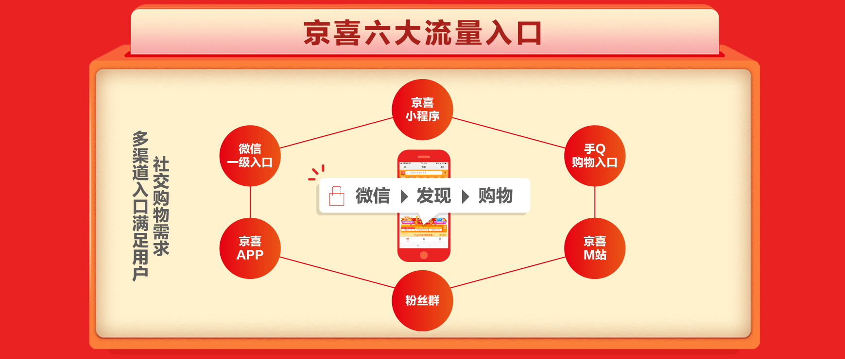 深圳新聞網(wǎng)2019年11月1日訊 10月31日,京東旗下社交電商平臺京喜正式接入微信一級入口,消費者只需點擊“微信-發(fā)現(xiàn)-購物”即可訪問京喜。這也宣告著京喜在微信一級入口、手機Q Q、京喜小程序、京喜APP、京喜M站、粉絲群6大移動端渠道完成全域戰(zhàn)略布局。