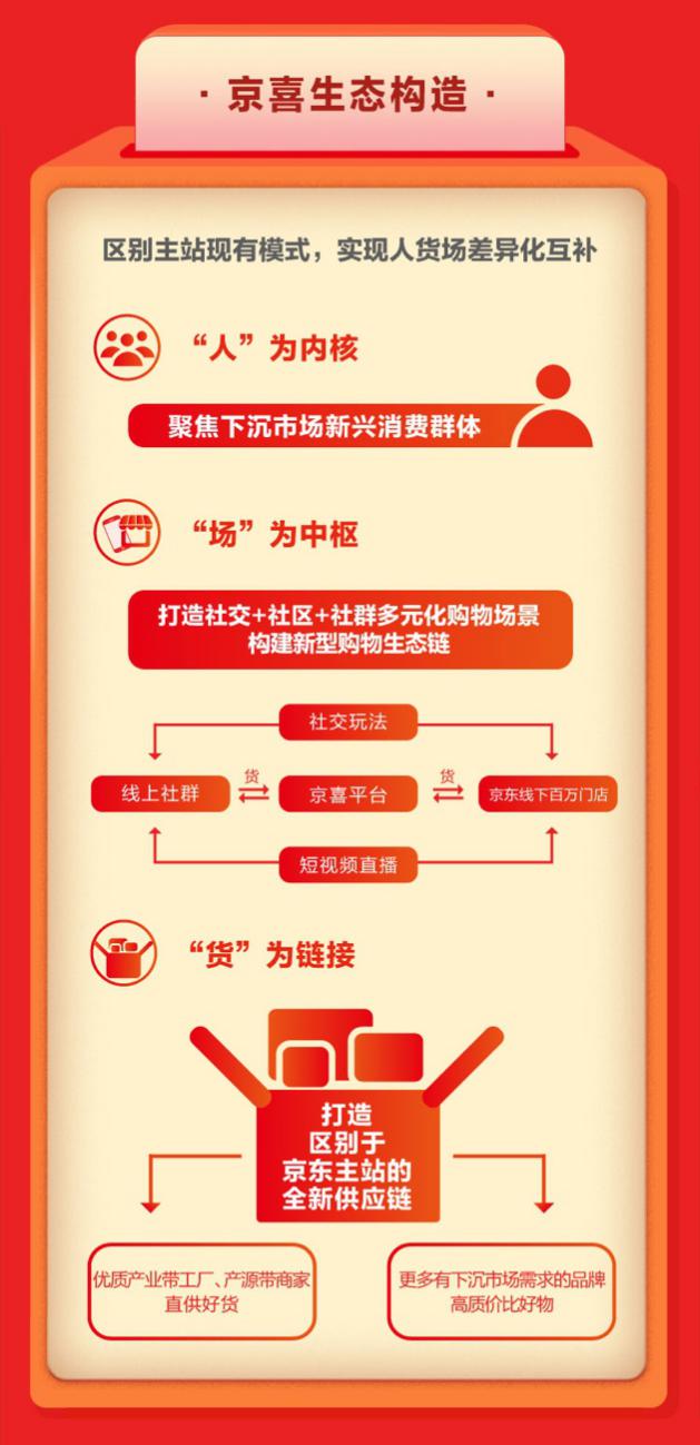 今年,京東打造了區(qū)別于京東主站現(xiàn)有場景和模式的全新平臺——京喜,于9月19日正式上線。京喜聚焦于下沉新興市場消費人群,通過高質(zhì)價比好貨及豐富的社交玩法,與京東主站實現(xiàn)了“人”、“貨”、“場”的差異化互補。