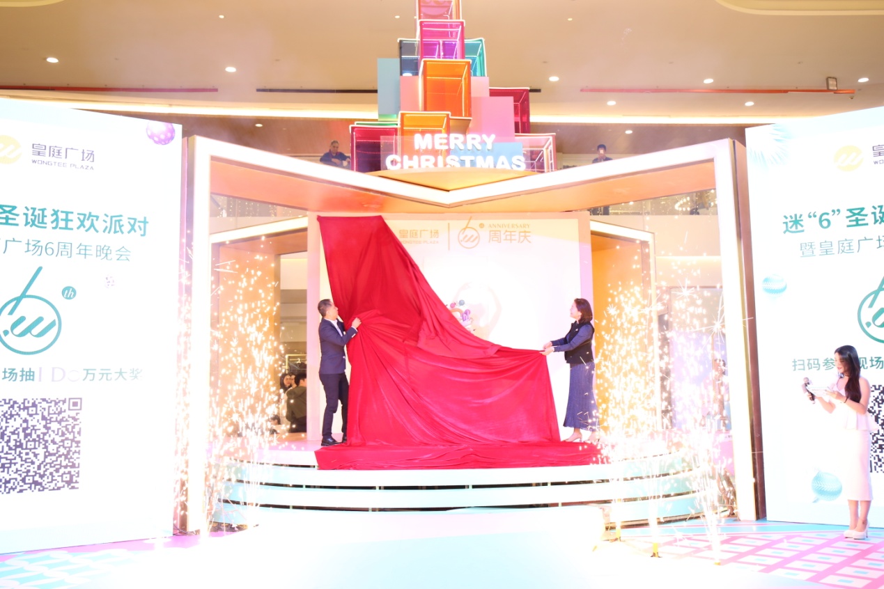 慶典當(dāng)晚,伴隨著圣誕女郎精彩的開場熱舞表演,令人無比期待的六周年藝術(shù)蛋糕,在諸多重量級(jí)嘉賓和現(xiàn)場觀眾的共同見證下,由皇庭商業(yè)管理集團(tuán)副總裁兼皇庭廣場總經(jīng)理關(guān)為泓、中購聯(lián)全國總編輯陳勇堅(jiān)共同揭開幕布,奇光異彩的藝術(shù)蛋糕瞬間驚艷呈現(xiàn)在眾人眼光,也正式宣告“深圳皇庭廣場六周年”狂歡盛典的開啟。