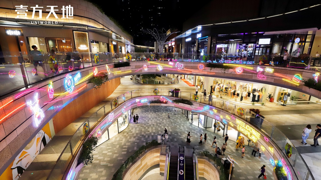 “顏值是第一生產(chǎn)力”,要打造夜間標桿,氛圍營造必不可少。壹方天地將燈飾與建筑、綠植等多個元素巧妙結合,璀璨的景觀燈、夢幻的星星燈、妙趣橫生的IP主題霓虹燈烘托出獨具一格的藝術氛圍。夜晚時分搭配噴泉秀和噴霧,光影夢幻,玉壺光轉,營造出極富層次感的夜景。同時,通過加強外圍的燈光照明等,持續(xù)亮化夜間氛圍,壹方天地成為夜間休閑、聚會的絕佳場所。“消費者沒事也喜歡來走一走,享受工作之余的休閑時光?!迸藸N峰說道。