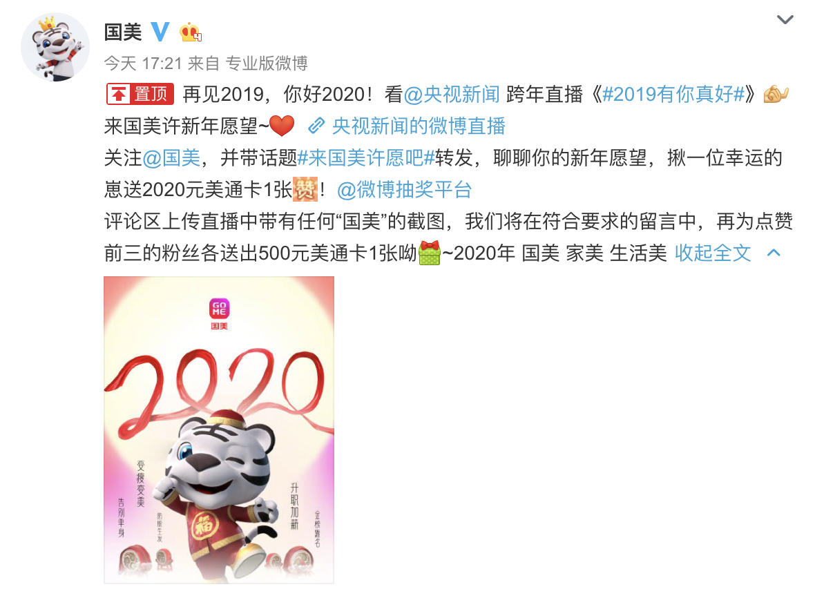 1月1日凌晨,在央視新聞跨年直播中,微博 ID為“考不上回去喂豬”的網(wǎng)友在不經(jīng)意間獲得了價(jià)值20000元的國(guó)美“全屋家電大換新”大獎(jiǎng),成為2020年首個(gè)幸運(yùn)兒。突如其來(lái)的大獎(jiǎng)讓她激動(dòng)萬(wàn)分,自稱為2020年開(kāi)了個(gè)好頭,也感謝國(guó)美與央視送給自己的新年禮物,同時(shí)表示自己還沒(méi)有成家,要把大獎(jiǎng)轉(zhuǎn)送給父母。