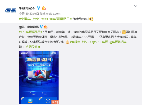 1月10日,今年的蘇寧易購華碩超品日將再次啟動,1月3日正式進(jìn)入預(yù)熱階段,今天早上蘇寧電腦數(shù)碼官微賬號,發(fā)布了今年華碩超級品牌日活動的正式信息,華碩官方賬號也第一時間與之進(jìn)行了回應(yīng)互動。